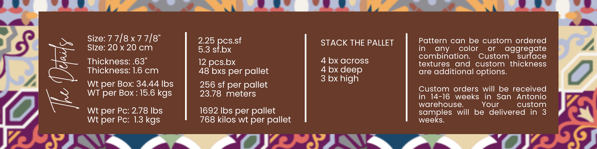 The design is available in sizes 8 x 8" (20 x 20 cm) and 12 x 12" (30 x 30 cm). The customary thickness for all cement and terrazzo tile is .63" (1.6 cm). The 8 x 8" tile can be ordered for vertical surfaces only in thickness of .55" (1.4 cm) or .39" (1.2 cm).