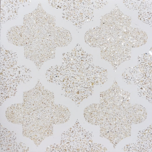 The design is available in sizes 8 x 8" (20 x 20 cm) and 12 x 12" (30 x 30 cm). The customary thickness for all cement and terrazzo tile is .63" (1.6 cm). The 8 x 8" tile can be ordered for vertical surfaces only in thickness of .55" (1.4 cm) or .39" (1.2 cm).